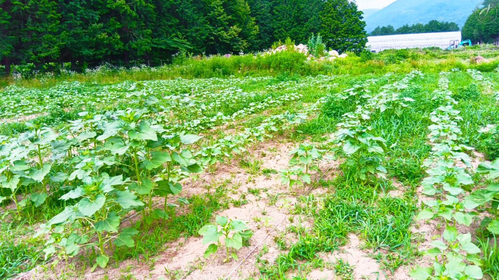 現在、ひまわりの株の周囲を就労継続支援B型事業所「ベーシック憩」の皆さんに除草していただいています。今後の予定は通路の草を管理機で抑えたり、葉の様子をみながら発酵液や虫除け液を葉面散布していきたいと思っています。