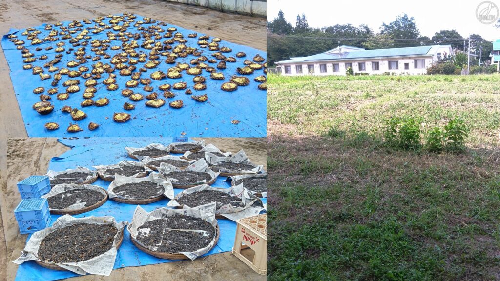 収穫後のひまわり畑と乾燥中のひまわりの様子